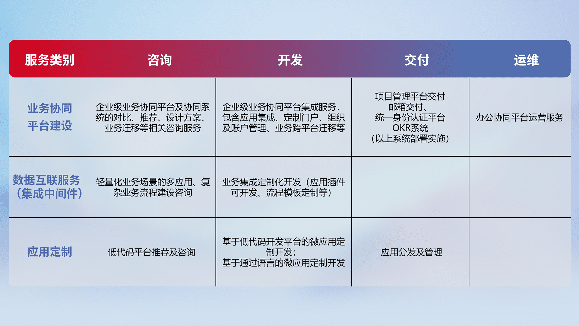针对钉钉、、、、企微、、IDaas等平台级产品提供产品的规划、、方案、、、交付、、定制化开发等服务,,,,实现如统一协同办公、、、、智能客户服务、、、混合会议管理、、、智能数据查询、、等业务场景,,实现数字化转型。。。。
