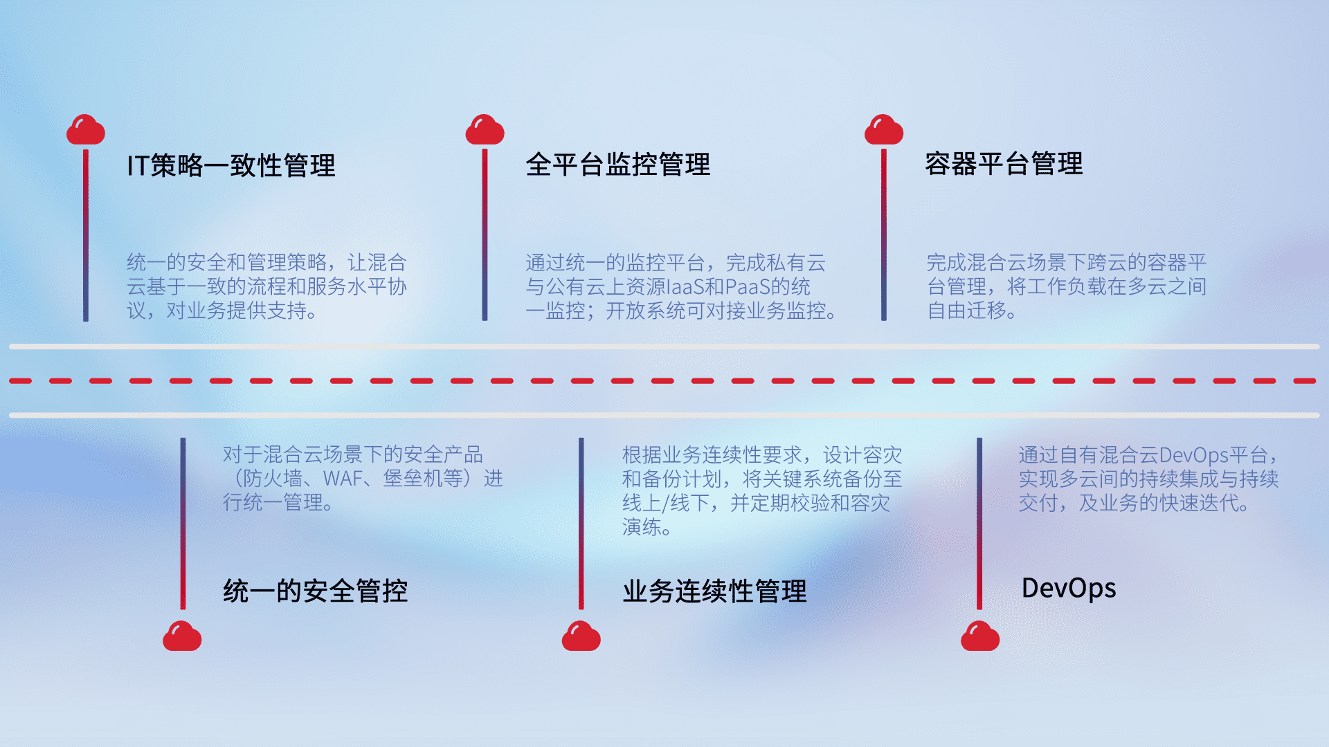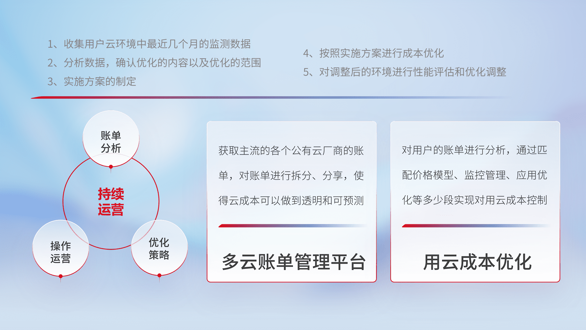 通过多云纳管,,以统一的资源数据模型把客户的云资源进行抽象和封装,,,进而实现对多云资源的统一操作,,,,保障云资源管理的可靠性、、稳定性与可用性。。。。量身定制化运维内容,,配置、、、开发运维、、补丁管理、、、、备份、、监控、、、认证和访问管理、、、、审计和日常巡检等,,,保障在用云过程中的可靠度,,,稳定度以及高可用率。。。